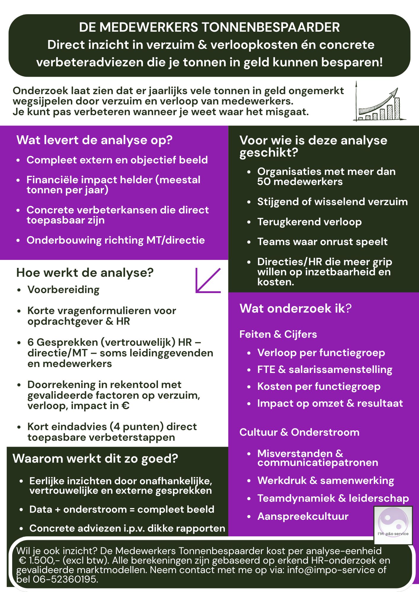 De Medewerkers Tonnenbespaarder is geen standaard analyse, maar een combinatie van inzicht én praktisch HR-advies, gericht op duurzame inzetbaarheid en groei met vertrouwen.